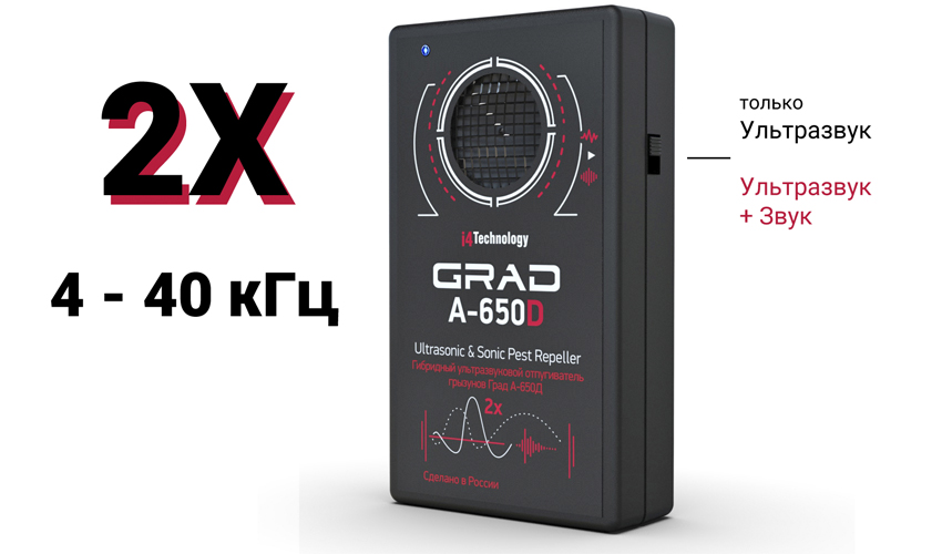 В режиме 2х мощности отпугиватель "ГРАД А-650Д" действует даже на вредителей внутри стен!