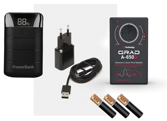 При необходимости отпугиватель "Град А-650Д" может работать от сети 220 В, аккумулятора, автомобильного прикуривателя или батареек ААА